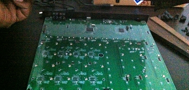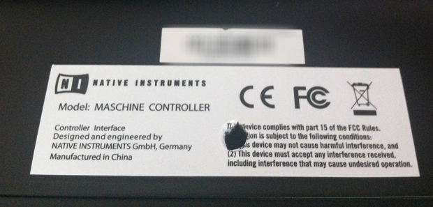 Now that we’re all prepped let’s get this Native Instruments Maschine disassembled. The first order of business is to remove the 11 knobs from the top of the casing. Next, we have to remove the bottom panel, which means removing 12 screws from the bottom of the casing. With the Maschine turned over with its face down, there are 4 screws towards the front panel, 4 screws towards the back panel, two screws along the left side and a center screw. With all of the aforementioned screws removed you would think that the bottom panel would come right off pretty easily. No dice. That’s because there is a hidden screw towards the front center beneath the ‘fcc rules’ sticker. Tricky indeed. So what you need to do here is grab your screw driver and find the hollow spot beneath the sticker to remove the screw (hint: it’s right about where these words are on the sticker… “This device complies with part 15 of the FCC rules.”).