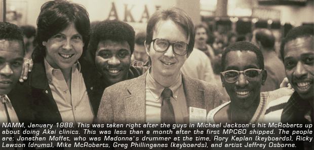 A couple months later, at the January 1988 NAMM Show in Anaheim, I was approached by three members of Michael Jackson’s band touring for the BAD album. They explained their touring schedule, which basically was one week in each city. They had some free time every week and asked if they could do a clinic in each city for Akai. I couldn’t say “No” to that, since this was the biggest tour on earth at the time. So, every week I flew to a different city and Ricky Lawson, drummer, Greg Philliganes and Rory Kaplan, keyboard players did a clinic. I was the master of ceremonies, and these guys came up with the whole clinic format. They used an MPC60, S900, a couple of keyboard controllers, and an MG1214 recorder at each clinic. It was very informative and entertaining, particularly because Greg Phillinganes is one of the funniest guys I’ve ever met.