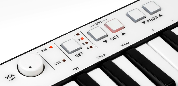 The front panel of iRig Keys is well laid out with loads of functionality without compromising it’s sleek look. Most apparent are the Volume / Data knob, iOS / USB indicator leds, Set button, Oct up and down buttons and Prog up and down buttons. The lay out is pretty straight forward. The volume knob obviously controls the volume by default but because it is assignable to any CC message number it can become almost anything you need it to be. I enjoyed mapping it to filter cut off when I used it with the Arctic keys app (which is listed as an iRig Keys compatible app on IK Multimedia’s site by the way). The iOS / USB indicator leds simply indicates which type of connection is currently in use. The Set button is a cool feature that we haven’t seen much of on other small form factor controllers. It allows you to store up to 4 separate and specific set configurations for easy recall which is invaluable to a live performer. The Oct up and down buttons allows you to expand the octave range of the controller from it’s default C2 – C5 by simply pressing either of the up or down octave buttons. Lastly, the Prog up and down buttons allow you to switch between presets. This works particularly well with iGrand and iLectric as it not only switches the preset but it has a cool visual representation that changes from one piano image to the next. Admittedly, I realize the animation may not be as important as the ability to change presets but it was worth mentioning anyway.