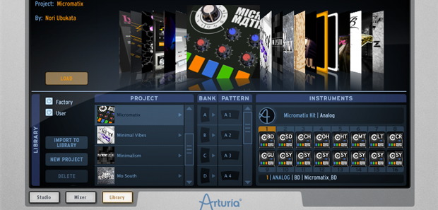 The Library section is where you manage your (what else?) sound library. This set up is reminiscent of iTunes album artwork “glide by” sort of presentation. The included kits all have their own artwork with project title and credit to the author of the kit. Here you can import kits to library, create new projects, delete projects and switch between user or factory presets.