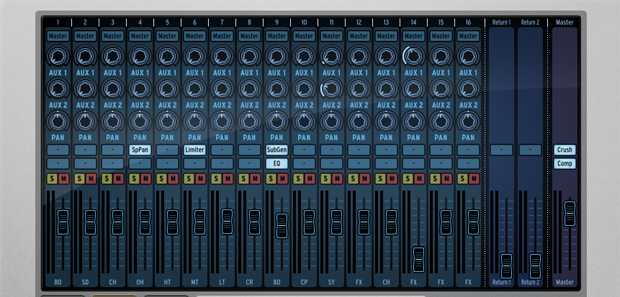 Moving along, the Mixer screen is the 16 channel mixer. Not too shabby at all. Each channel has two effects inserts plus two aux sends, solo and mute. The master channel allows for access to insert effects as well. You can easily mix a solid beat with as much or as little ummph as you can imagine with this set up. The included effects are crush, chorus, comp, delay, distortion and a gang of other options.