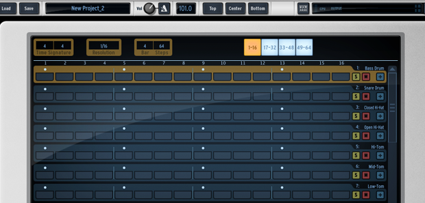 The Top portion of the software is dedicated to the pattern and song features. It allows you to toggle between each feature via the dedicated software buttons on the bottom of the screen.